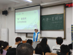 宣讲过程中,身着统一蓝色志愿者服装、佩戴白色帽子的“追光者”队员们精神饱满。他们巧妙运用“小故事+大精神”的叙事方式,以充沛的情感生动讲述了邓稼先、钱学森等老一辈科学家放弃国外优厚待遇、隐姓埋名扎根戈壁,最终成就“两弹一星”惊世伟业的感人事迹,深刻阐释了“热爱祖国、无私奉献,自力更生、艰苦奋斗,大力协同、勇于登攀”的“两弹一星”精神内核。教室内座无虚席,学子们神情专注,聆听中不时流露出敬佩与思索。