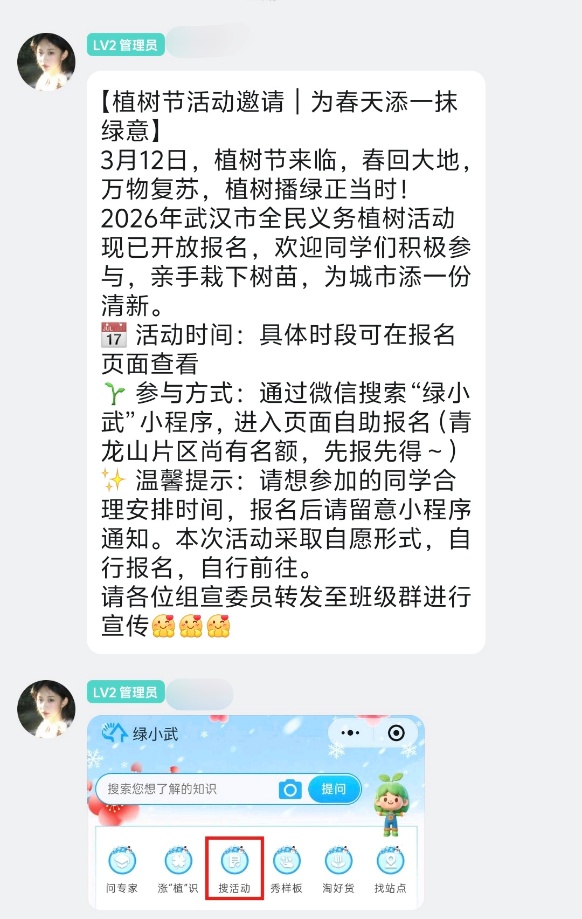 此次宣传活动得到同学们的积极响应。义务植树是每位公民的法定义务,作为新时代大学生,更应走在前列,通过亲手栽下一棵树、养护一片绿,将生态文明的种子根植于心、践之于行。许多同学通过“绿小武”小程序查看了活动安排,并计划在周末组队前往黄陂胜天农庄、蔡甸金龙村等大型植树点,体验挥锹培土、播种希望的乐趣。