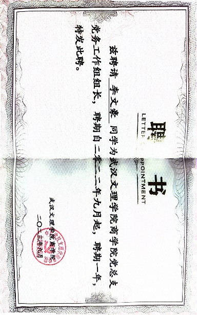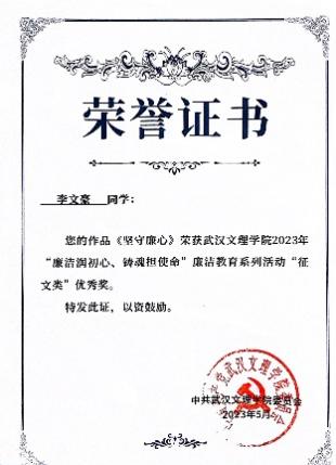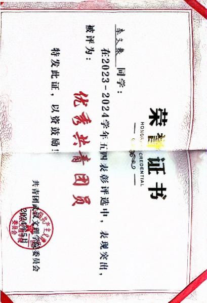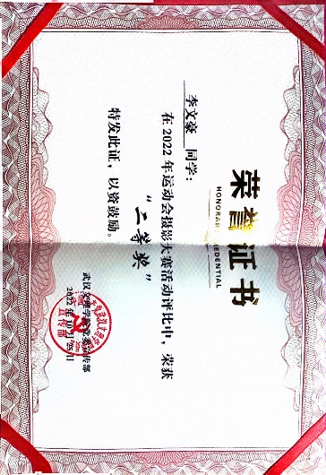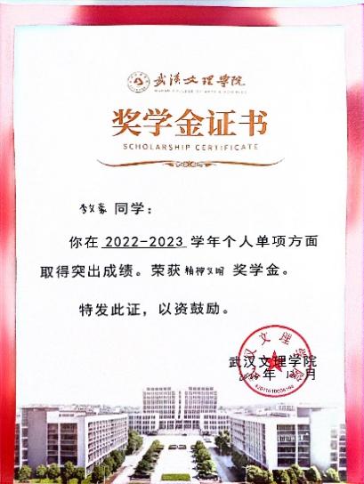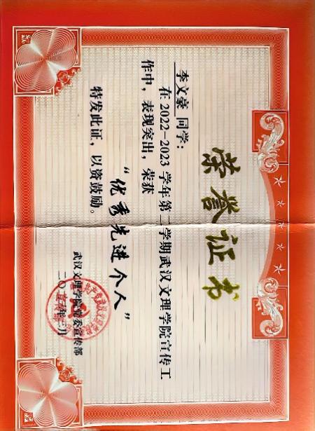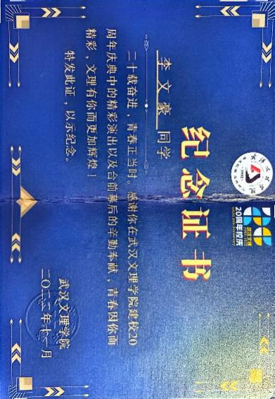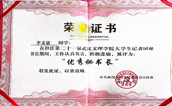 李文豪4次获得“优秀学生干部”、获“优秀学生干部标兵”。在担任21届大学生记者团秘书长期间,参与宣传20周年校庆(独立完成校庆PPT)、文理群星五四表彰、毕业典礼、智能制造与无损检测威廉体育williamhill成立等多项活动,获优秀宣传先进个人称号。参与校史编辑,收获20周年纪念证书。