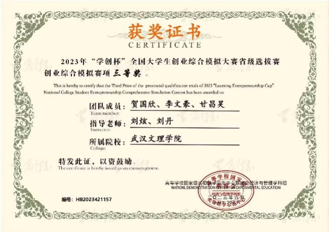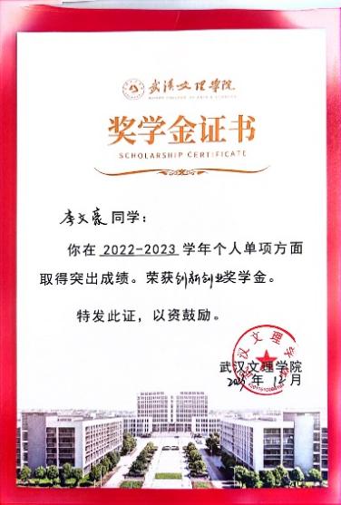 李文豪深知学习的重要性,两年综测第一,连续三年德育、智育素质排名双第一,多次荣获“一等奖学金”、“创新创业奖学金”、“精神文明奖学金”“突出才艺奖学金”。他的专业课成绩平均分90.07,英语类成绩平均分90,思政类成绩平均分90.69,三年来成绩稳步上升。